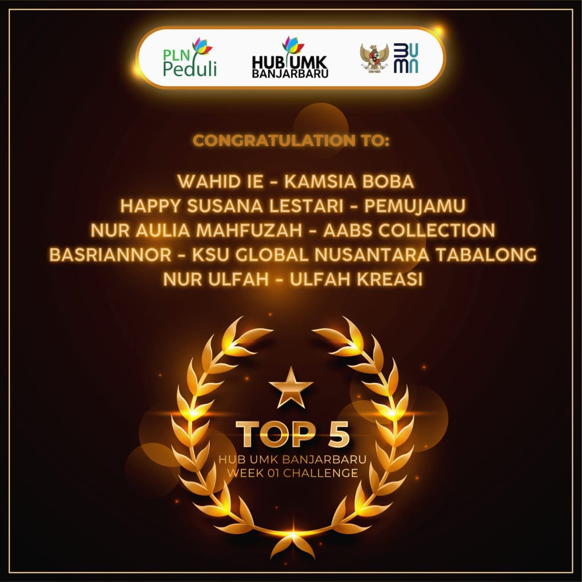 Kelima pemenang tersebut berhak mengikuti “Grand Final Challenge” yang akan diadakan pada minggu ke-6 atau pada hari Senin tanggal 3 Februari 2025 (tentatif), pemenang juga mendapatkan hadiah Pin Eksklusif HUB UMK Banjarbaru serta token listrik atau saldo e-wallet.
